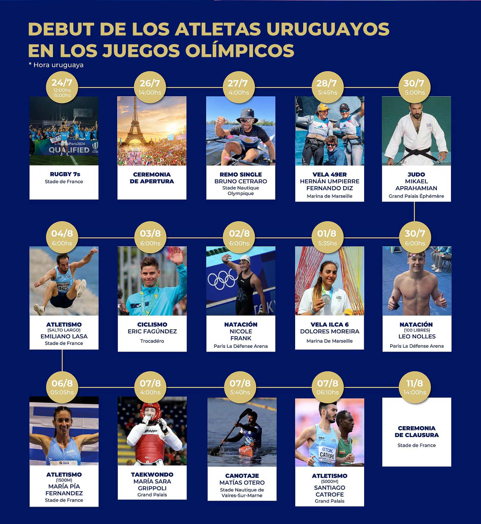 Las competencias comenzarán mañana con el torneo de rugby seven, día en el que debutará Uruguay enfrentando a Fiji, el actual bicampeón olímpico. Desde miércoles también se estarán jugando los campeonatos de fútbol masculino y femenino, aunque no tendrán la presencia de Uruguay.