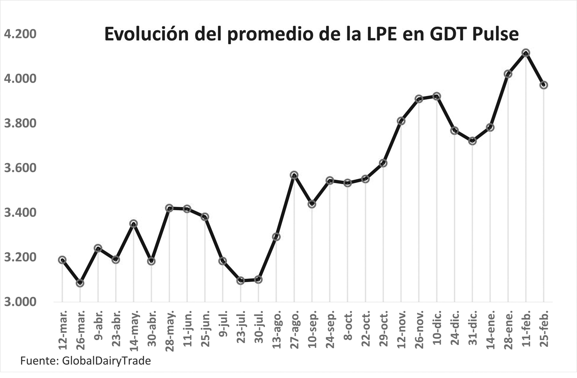 El precio promedio obtenido para la leche en polvo entera (LPE) fue de US$ 3.972 por tonelada, lo que representa una caída del 3,5% respecto a la licitación anterior del sistema Pulse (-US$ 145). En tanto que, respecto a la cuarta venta de Pulse del año pasado, se observa un aumento del 22,4% sobre los US$ 3.245 de aquel momento.