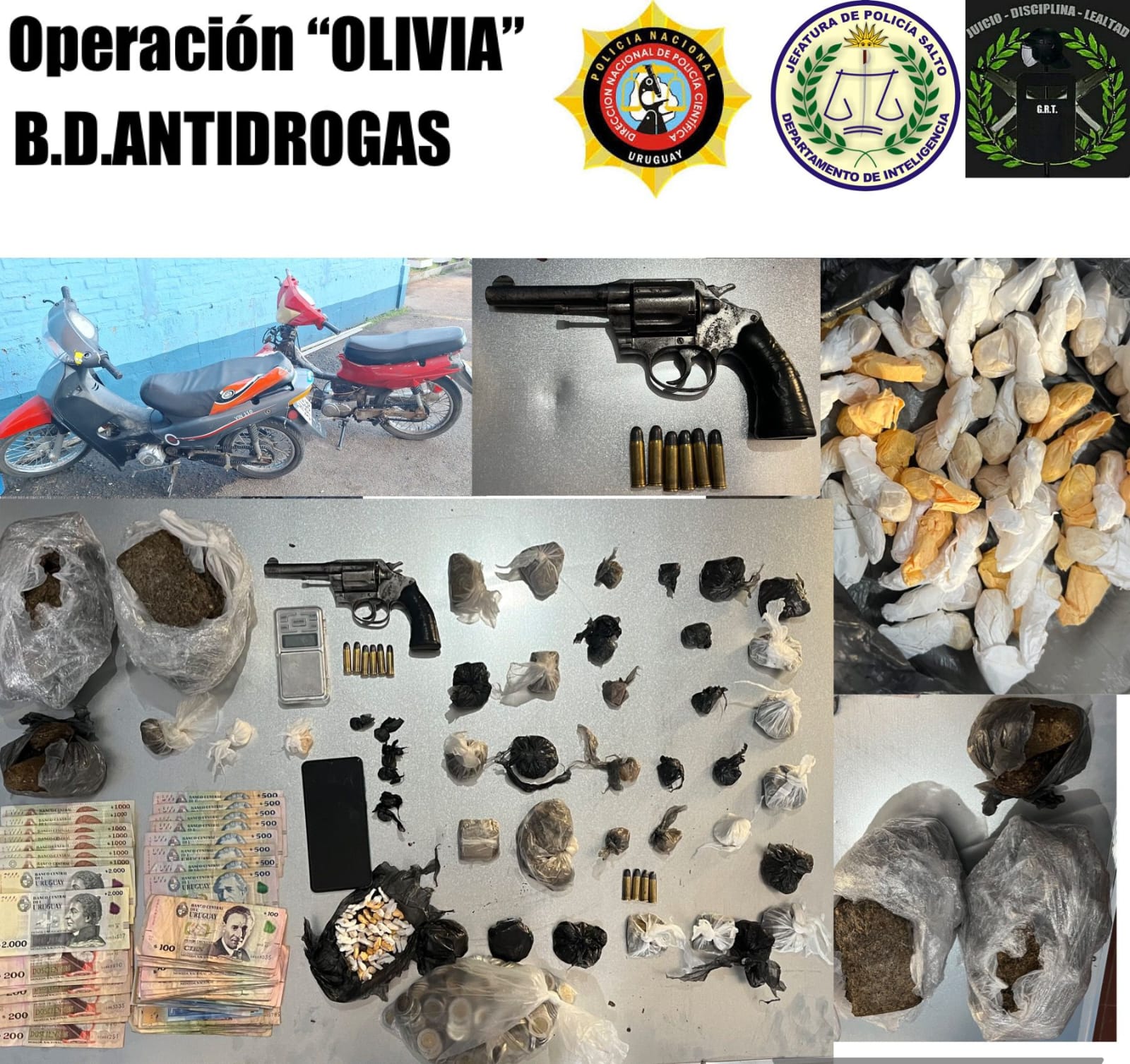 Durante la jornada de ayer, personal policial de la Brigada Departamental Antidrogas, con apoyo del personal de la Dirección de Investigaciones y G.R.T, llevaron adelante un allanamiento en una vivienda ubicada en calle Osimani a la altura del 600, autorizado por el Juzgado Letrado de 4to turno de Salto con previa solicitud de Fiscalía de 2do Turno. En el lugar se realizó la detención de seis personas mayores de edad (5 hombres y una mujer), procediendo a la incautación desde el interior de la casa de dinero en efectivo de baja denominación (billetes y monedas), sustancia amarillenta en envoltorios (chasquis), sustancia blanca, sustancia vegetal y un arma de fuego (revólver calibre 38), 10 proyectiles calibre 38. Además se incautaron dos motos, una balanza de precisión y varios celulares.