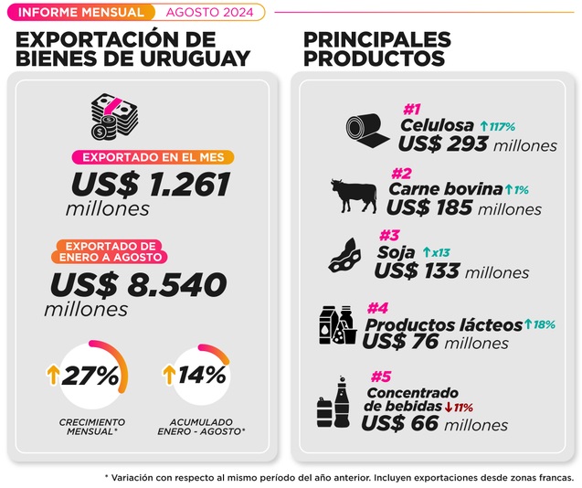 El principal producto exportado fue vehículos, por US$ 44 millones; sin embargo, a pesar del buen rendimiento de este sector, no se logró compensar la caída en las exportaciones de malta, lácteos, arroz y trigo. Este último fue el de mayor incidencia negativa, con exportaciones que totalizaron US$ 18 millones, menos de la mitad de lo exportado en agosto de 2023.