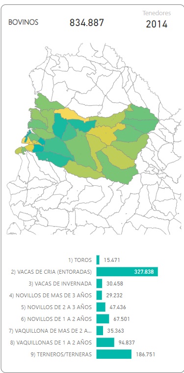 Por departamentos, se debe señalar que Artigas y Montevideo, son los únicos que registran un incremento en su stock. En el caso del departamento norteño, se pasó de 682.930 a 723.013 cabezas, con una suba del 5,9%, con un aumento superior al 13% en las vacas de cría entoradas. Por su parte, el área rural de la capital del país, paso de 2.105 a 2.174 cabezas.