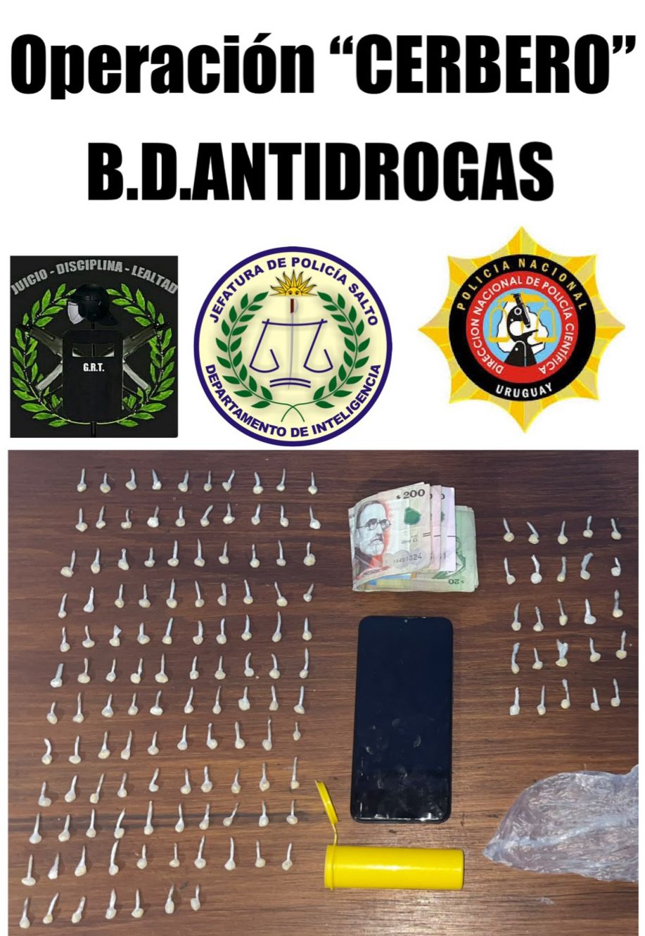 Tal y como informó CAMBIO en su portada de ayer, el martes se llevó adelante un operativo en barrio Fátima de nuestra ciudad, como continuación de la Operación Cerbero. Mediante inspecciones, se localizaron a dos hombres mayores de edad, de 43 y 18 años, los cuales se dedicaban a la venta de sustancias estupefacientes, y uno de ellos se descartó de 117 envoltorios de sustancia amarillenta en un tarrito de plástica y la suma de 970 pesos uruguayos. Se localizó además en uno de los Pasajes, un envoltorio de nylon con 25 envoltorios de sustancia amarillenta. Posteriormente la Policía procedió a realizar una inspección en una casa ubicada en las inmediaciones del Puente Blanco y logró detener a otro hombre mayor de edad a quien se le incautó un celular de color negro. Se pone en conocimiento de Fiscalia Actuante.