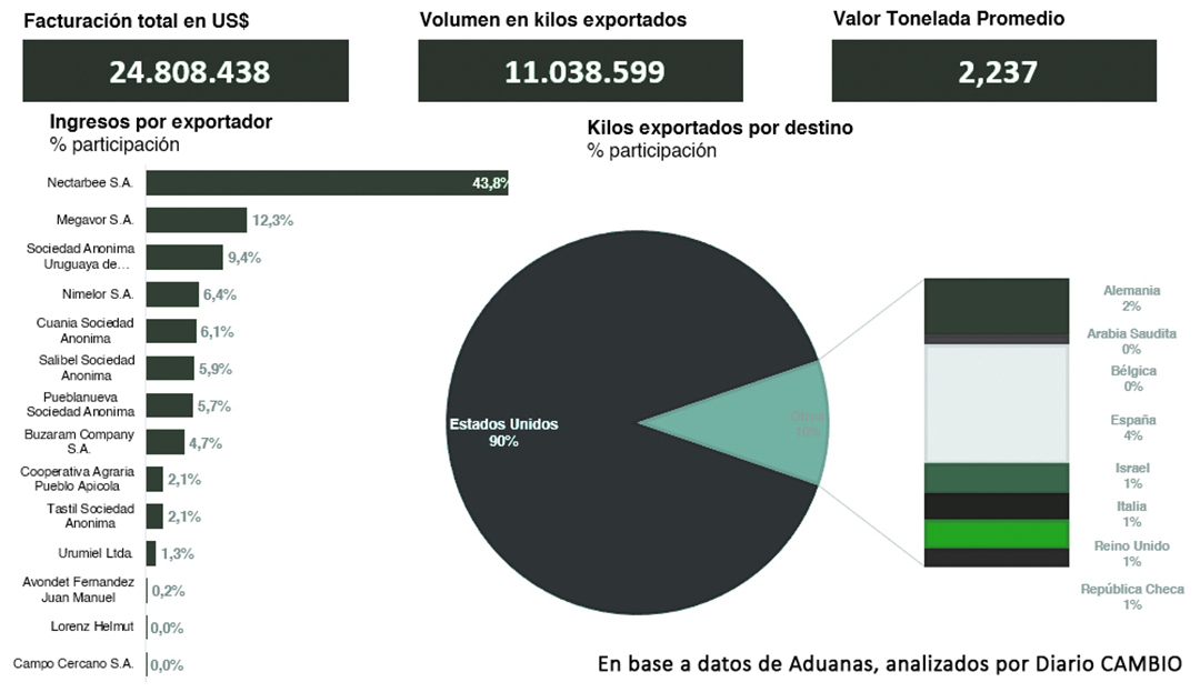En cuanto a las empresas líderes en la exportación de miel, Nectarbee S.A. se ha mantenido como la líder del ranking de ventas, con un 44% del ingreso de divisas al país. El 95% de la facturación de esta empresa proviene de sus exportaciones de miel al mercado estadounidense.