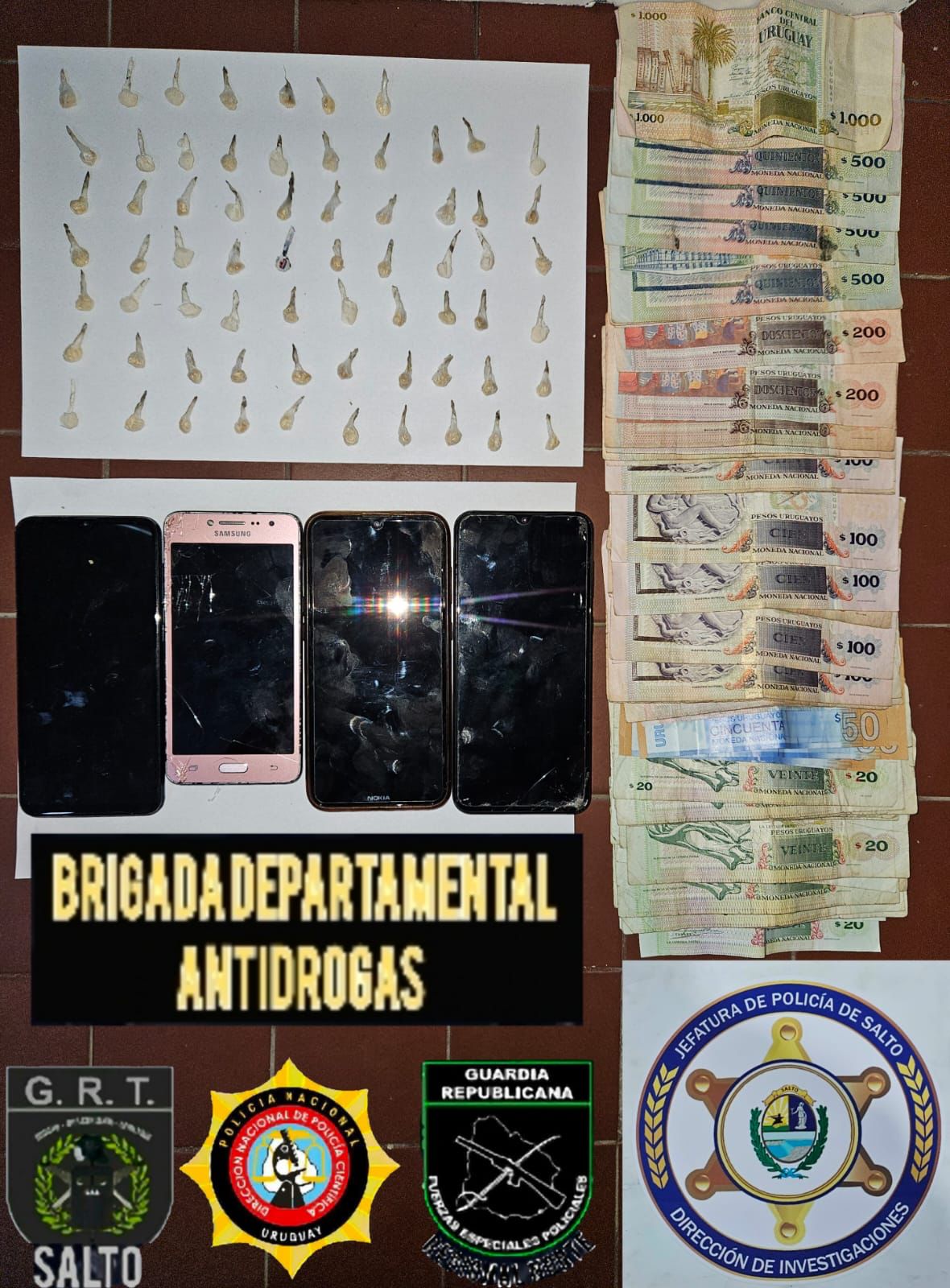 De acuerdo a la información colectada y analizada por personal de Áreas Investigativas de la Dirección de Investigaciones, surgió que se estaba realizando venta de estupefacientes en barrios de la zona sur de la ciudad. En coordinación con Fiscalía de 2do y 3er turno de Salto y órdenes de allanamientos expedidas por Juzgado letraso de Cuarto Turno de Salto, el martes por la tarde personal de Investigaciones con Brigada de Narcóticos con apoyo de Guardia Republicana y GRT, realizaron cinco allanamientos donde se logró la detención de tres hombres mayores de edad, una mujer menor de edad y la incautación de 67 envoltorios de sustancia estupefaciente dolor amarillenta compatible con pasta base, 7.554 pesos uruguayos, 4 teléfonos celulares de distintas marcas y una moto marca Baccio P110. Se procedió a la documentación por Policía Científica y se entero a Fiscales intervinientes.
