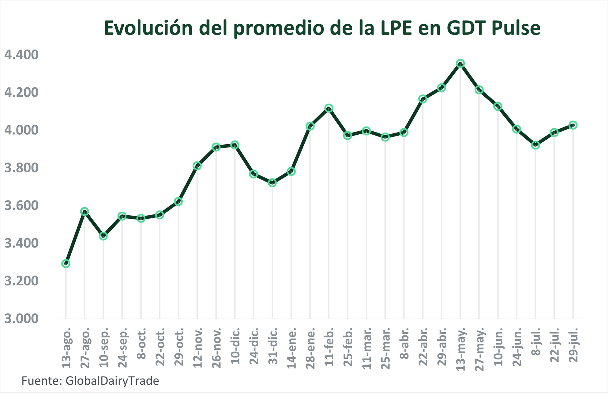 El precio promedio obtenido para la leche en polvo entera (LPE) fue de US$ 4.027 por tonelada, volviendo a posicionarse sobre los US$ 4.000 tras dos subastas donde se ubicó por debajo de esa referencia. En esta oportunidad se registró una suba del 1% (US$ 39).