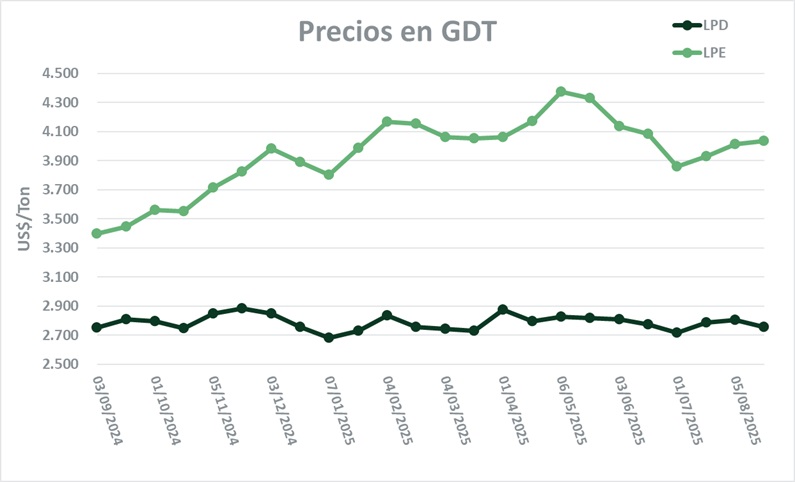 En la licitación número 386 de la plataforma Global Dairy Trade (GDT), realizada este martes 19 de agosto, los lácteos mostraron un retroceso en el promedio general de precios, arrastrados por caídas en la manteca, los quesos y la leche en polvo descremada. La única excepción fue la leche en polvo entera, que logró mantener su corriente alcista, aunque con una variación mínima frente a la venta anterior.