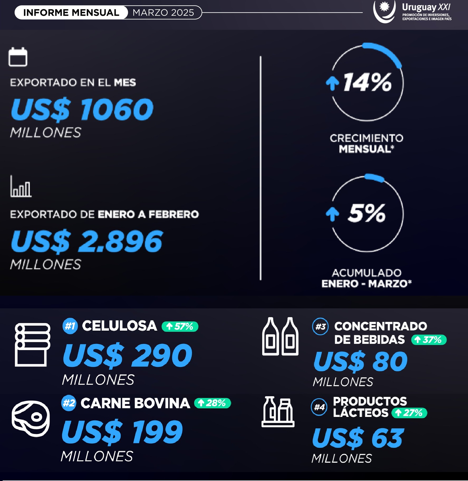 China se mantuvo como el principal destino de las exportaciones uruguayas en marzo de 2025. Las ventas al gigante asiático sumaron 212 millones de dólares, lo que significó un aumento del 35% en términos interanuales. El principal motor de este crecimiento fue la celulosa, cuyas exportaciones a China se duplicaron en comparación con el año anterior, alcanzando los 125 millones de dólares y representando el 59% del total exportado a ese país.