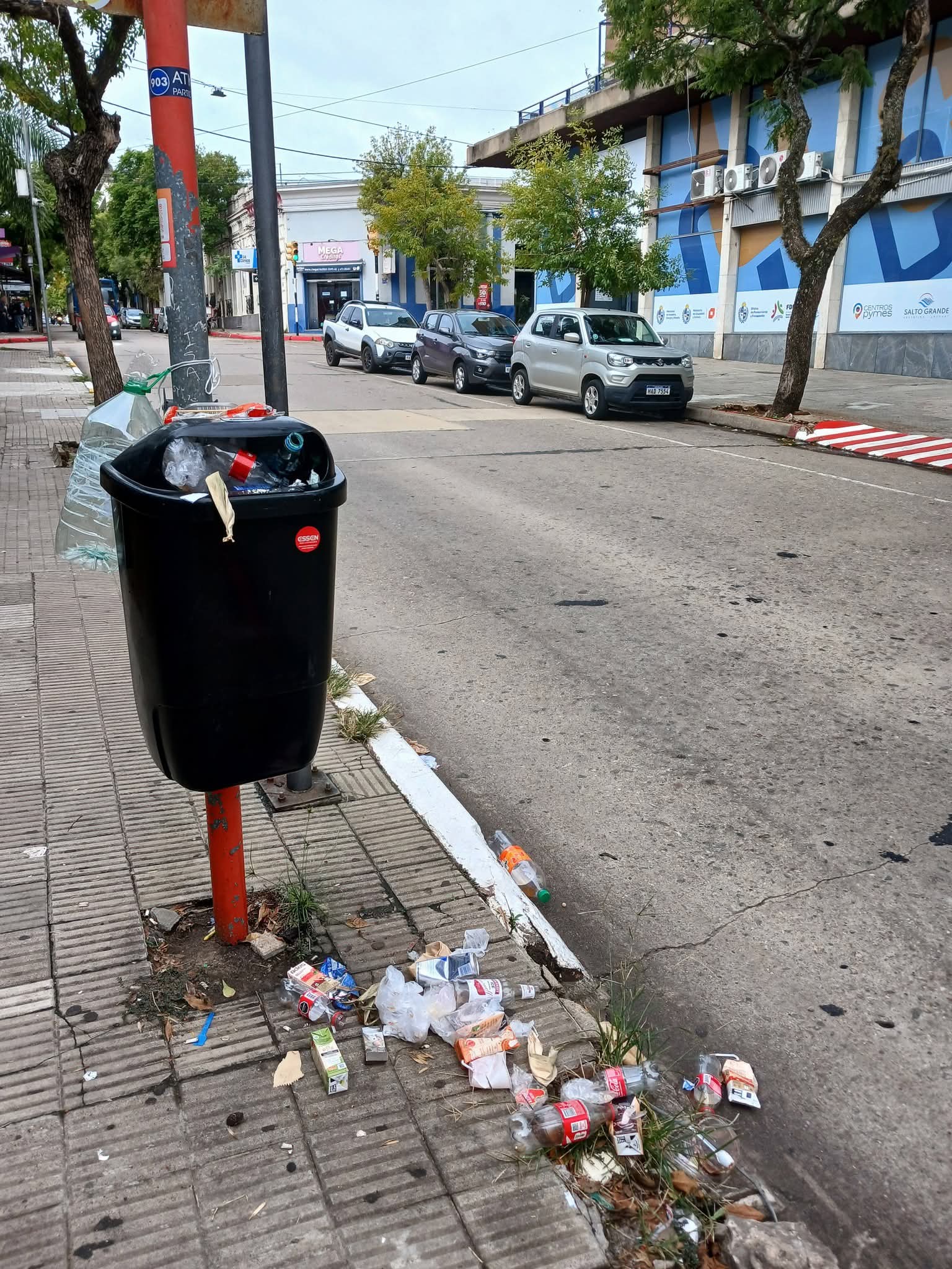 Todos queremos una ciudad limpia y prolija. Al menos quienes amamos a Salto queremos vivir en un lugar sin basura y agradable visualmente. Pero si el ciudadano no se compromete con eso, resultará muy complejo cumplir ese sueño. Ya que no basta con que desde la Intendencia se hagan limpiezas o se recoja la basura, tiene que haber una conducta responsable de la gente a la hora de desechar basura y depositar los residuos en tachos en forma correcta. La imagen corresponde a calle Artigas esquina Sarandí, en una de las paradas de ómnibus urbano, donde mucha gente aguarda por el servicio. La imagen es penosa.