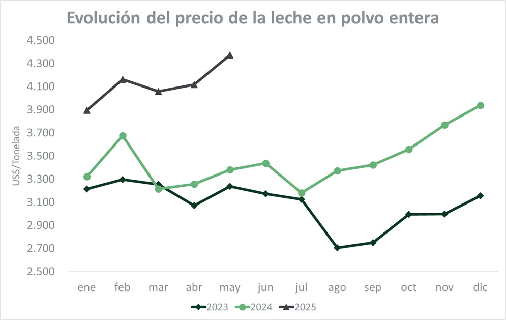 El valor promedio para la leche en polvo entera (LPE) fue de US$ 4.374 por tonelada en esta licitación y marcó una suba del 6,2% respecto a la venta anterior (US$/ton 203), en tanto que respecto a 2024, la suba fue del 31%. Para encontrar un nivel de precio de la LPE igual o superior a los niveles actuales hay que remontarse a la primera licitación de abril de 2022 (US$/t 4.532).