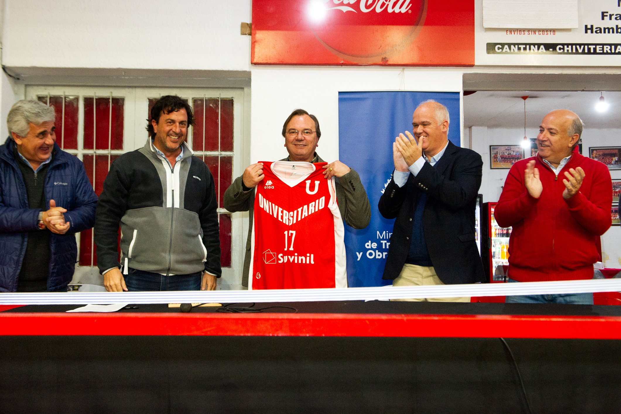 Los dirigentes del club, Ignacio Cujó, Edgardo Revello y el senador Germán Coutinho, recibieron a las autoridades y tras el corte de cinta le regalaron al ministro una camiseta de la institución.
