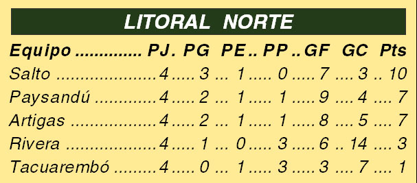 Resultados (5ª fecha): Artigas 2 Salto 2, Tacuarembó 0 Paysandú 0. Fecha libre: Rivera.