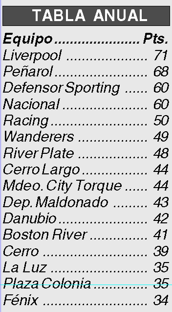 Torneo Clausura: Liverpool 32; Racing 25; Peñarol 24; Defensor Sporting 21; Boston River, Nacional y Montevideo City Torque 20; River Plate 19; Deportivo Maldonado 18; Danubio 16; Plaza Colonia 15; Wanderers 14; La Luz y Fénix 13; Cerro y Cerro Largo 11.