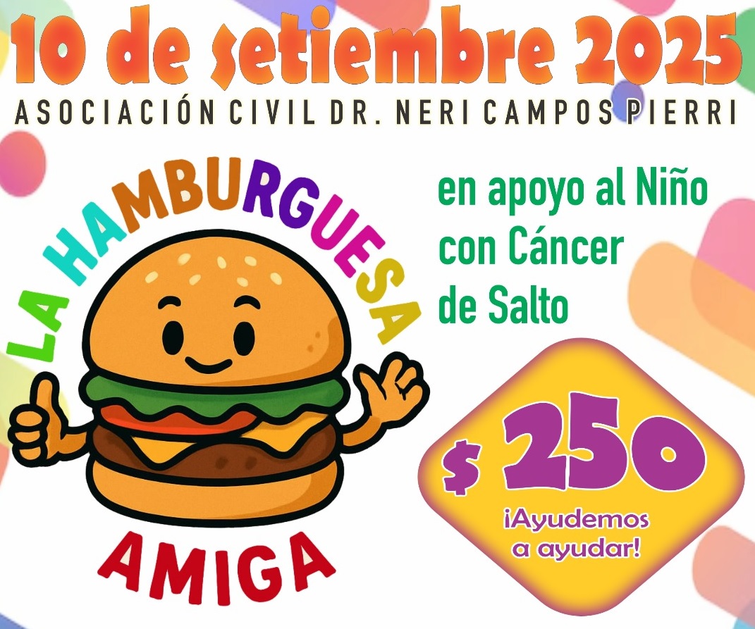 Este miércoles 10 de setiembre de 2025, la comunidad salteña será protagonista de una nueva muestra de solidaridad a través de la tradicional campaña “La Hamburguesa Amiga”, organizada por la Asociación Civil Dr. Neri Campos Pierri. La iniciativa, que ya se ha consolidado como un evento esperado en el calendario local, tiene como objetivo recaudar fondos en beneficio del niño con cáncer de Salto, aportando recursos para acompañar tanto a los pacientes pediátricos como a sus familias. Con un espíritu de unión y compromiso social, la campaña propone que, por un valor de $250, cada persona pueda colaborar adquiriendo una hamburguesa solidaria. La consigna elegida —“Ayudemos a ayudar”— sintetiza la esencia de la propuesta: transformar un gesto cotidiano, como compartir una comida, en un acto de empatía capaz de marcar la diferencia en la vida de quienes más lo necesitan.