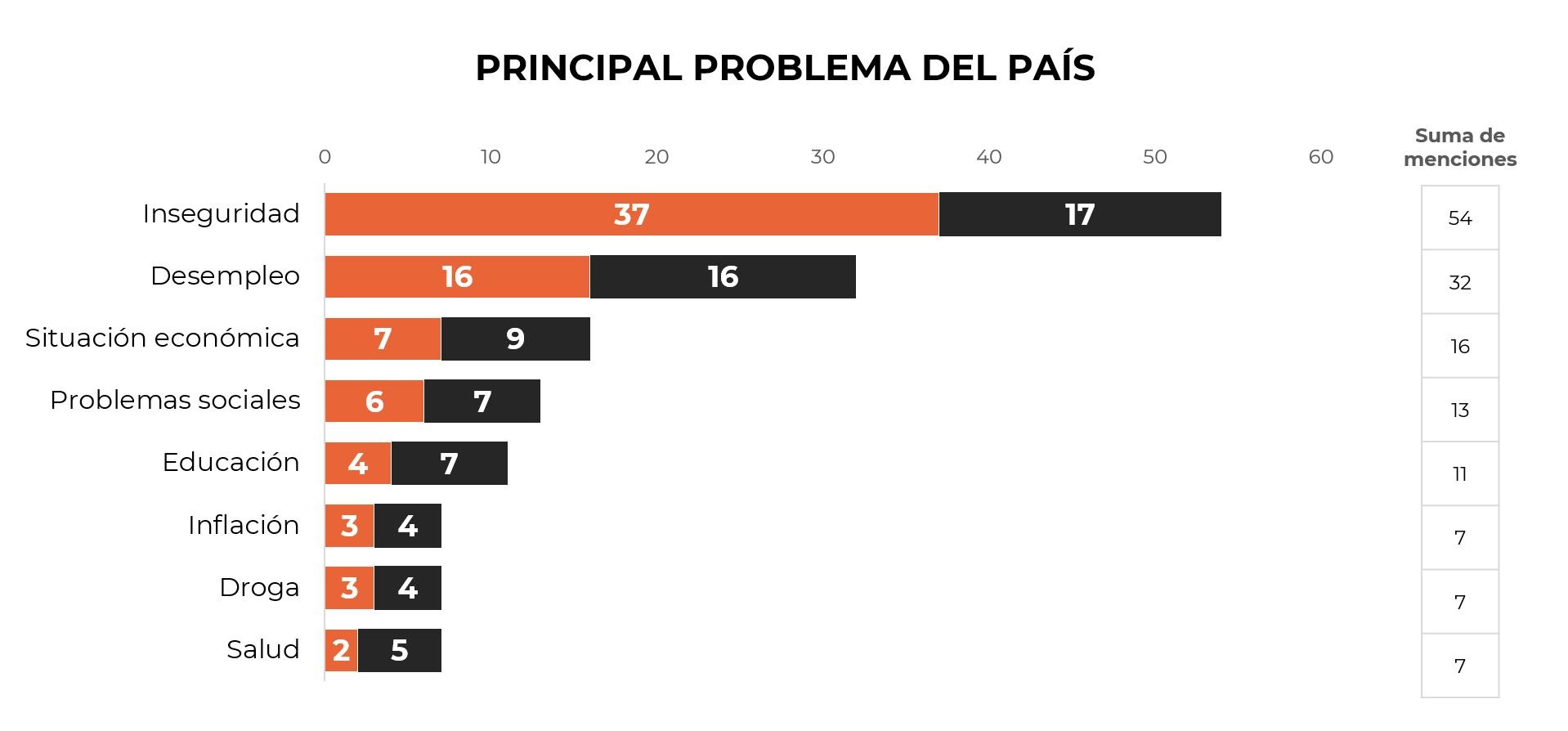 La “inseguridad” es el problema más mencionado, con 37% que lo elige como el más importante y un total de 54% que lo menciona ya sea en primer o segundo lugar. En un segundo plano se encuentra el “desempleo” (34% en suma de menciones), y luego hay un tercer escalón en el que se encuentran en un plano cercano la “situación económica” (16%), los “problemas sociales” (13%), y la “educación” (11%). Cuando se mira la evolución de las preocupaciones en el último año, se encuentra básicamente estabilidad. A lo largo de toda la campaña electoral, y durante los meses de la transición entre gobiernos, no se aprecian cambios significativos en la percepción que los uruguayos tienen sobre los problemas del país, aunque podría mencionarse un leve incremento de las referencias a “problemas sociales” en febrero que, creciendo a 13% ocupa el 4º lugar del ranking superando por primera vez a la “educación”.