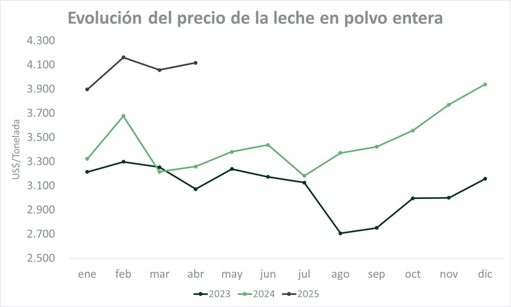 El valor promedio para la leche en polvo entera (LPE) fue de US$ 4.171 por tonelada en esta licitación y marcó una suba del 2,8% respecto a la venta anterior (US$/ton 109), en tanto que respecto a 2023, la suba fue del 28%. Para encontrar un nivel de precio de la LPE igual o superior a los niveles actuales hay que remontarse a la segunda licitación de abril de 2022 (US$/t 4.207).
