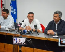 El intendente de Salto, Carlos Albisu, acompañado por el secretario general, Walter Texeira Núñez, y el jefe del Área Jurídica, Dr. Gabriel Rodríguez, brindó una conferencia de prensa este miércoles donde comunicó el cese de 291 funcionarios.