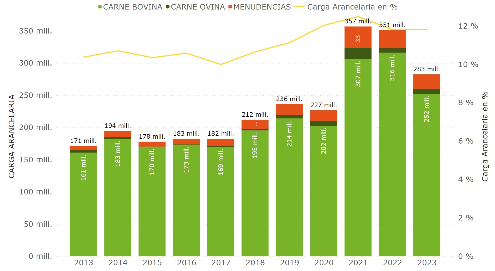 En el caso específico de la carne bovina, los aranceles pagados guardaron una relación directa con el valor de las exportaciones. Aunque el valor exportado de carne uruguaya en 2023 fue de 2.113 millones de dólares, un 20% menos que en el año anterior, los aranceles pagados por estas exportaciones experimentaron una disminución proporcional del mismo porcentaje. Esto mantuvo la presión arancelaria constante en 11,9%.