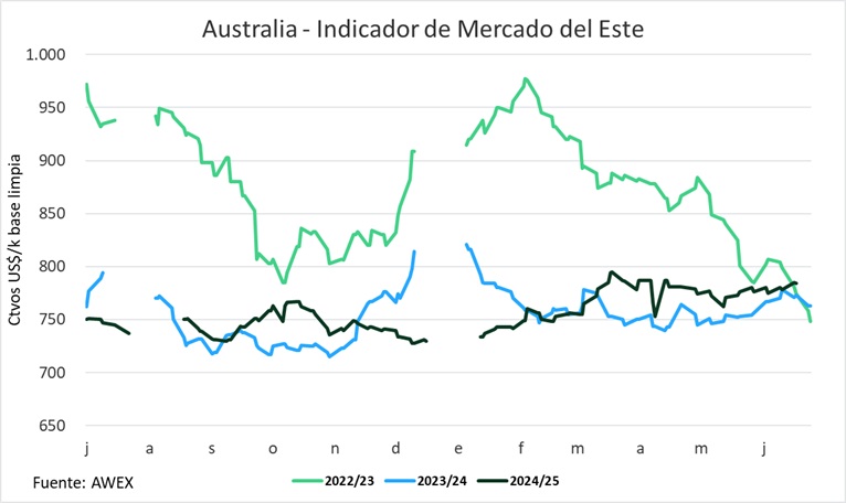 El Indicador de Mercados del Este (IME), cerró la semana en A$ 12,07 por kilogramo base limpia, lo que representa un aumento de 10 centavos australianos respecto a la semana anterior. En términos de dólares estadounidenses, el indicador se ubicó en US$ 7,84, registrando una suba de 6 centavos estadounidenses en comparación con el cierre de la semana previa.
