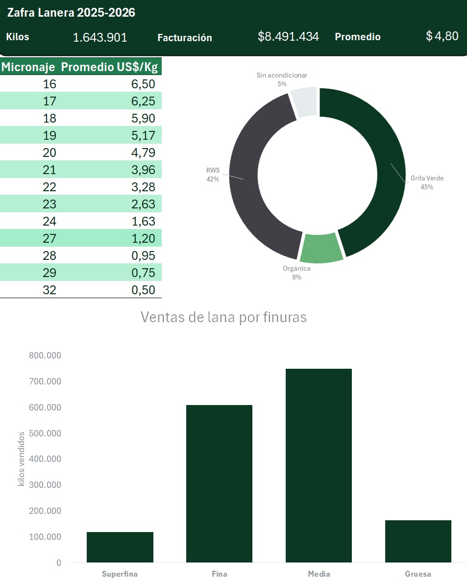 Durante los cuatro primeros meses de la zafra, se informó un volumen de 1.643.901 kilogramos de lanas vendidos, 47% más que en igual período del año pasado, con una facturación de US$ 8.491.434, implicando un incremento del 98% en los ingresos, debido al aumento de los precios entre zafras y el mayor nivel de lanas finas y superfinas comercializadas.
