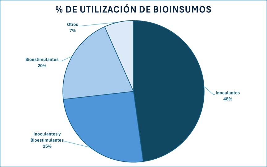En cuanto a la utilización efectiva, el 66% de las explotaciones reportó haber usado algún bioinsumo en los últimos dos años, lo que sitúa a la adopción en un nivel medio-alto para una tecnología todavía en proceso de consolidación comercial y técnica.