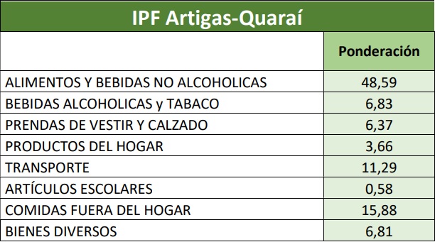 En esta división se releva el precio de 29 productos convirtiéndola en la que mayor influencia adquiere en el IPF Brasil, con un peso relativo en la canasta de 49%. En el relevamiento realizado en el mes de diciembre únicamente el yogurt muestra un precio promedio menor en Artigas que en Quaraí.