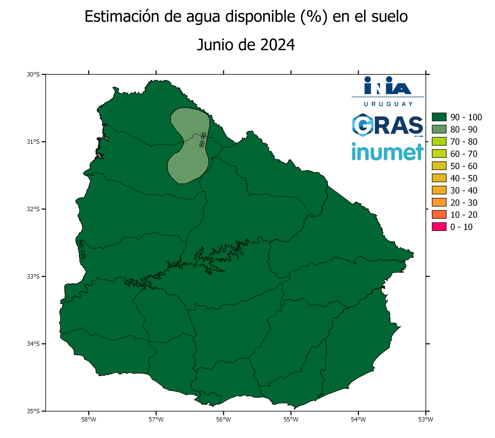 El monitoreo y análisis de la unidad GRAS del Instituto Nacional de Investigación Agropecuaria (INIA) sobre las variables agroclimáticas de junio, que incluyen precipitaciones, porcentaje de agua en el suelo, índice de bienestar hídrico e índice de vegetación, muestran que el estado hídrico promedio de los suelos fue favorable.