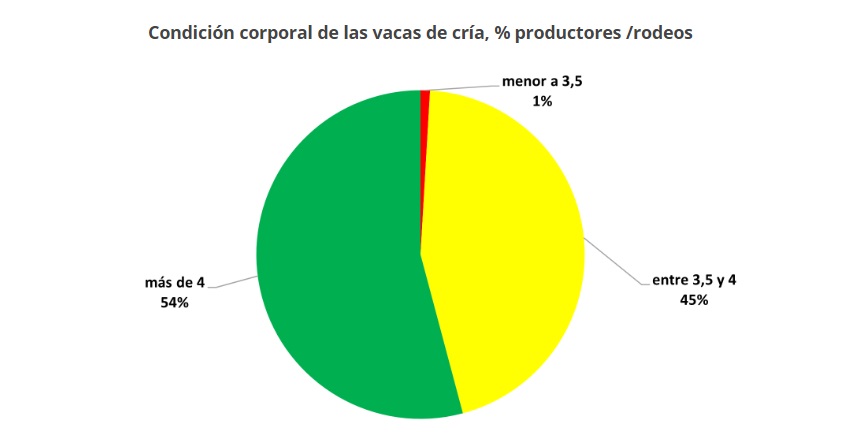 La condición corporal del ganado de cría muestra una tendencia positiva, con más del 50% de los productores reportando una condición superior a 4, y una notable ausencia de rodeos por debajo de 3.5.