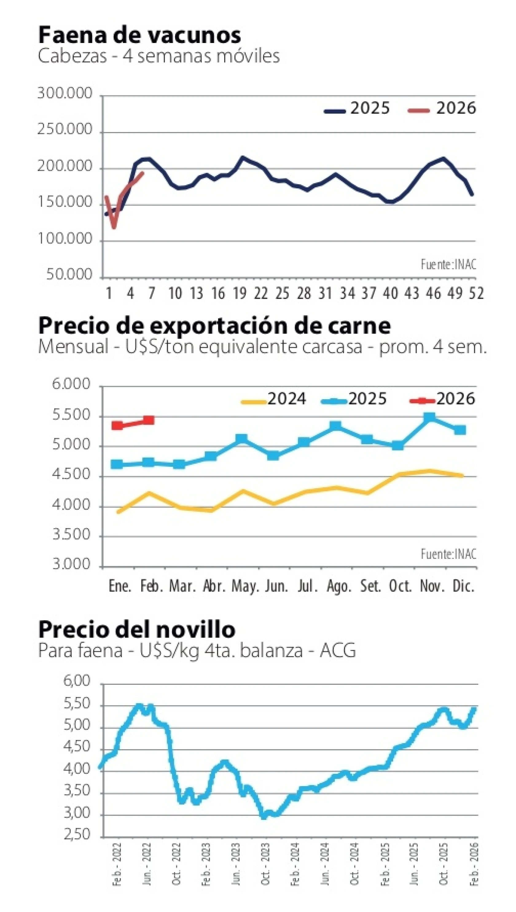 El precio del ganado para faena se sigue afirmando, con la referencia para los buenos lotes de novillos en 5,55 US$/kg a la carne . En el caso de las vacas la referencia se ubica en 5,10 US$/kg, con buenos lotes logrando valores superiores. Está transcurriendo otra “ventana” de la cuota 481, que en ocasiones previas generó un impacto a la baja en el ganado gordo de campo, pero no en esta ocasión; los precios están firmes y al alza en la plaza local.