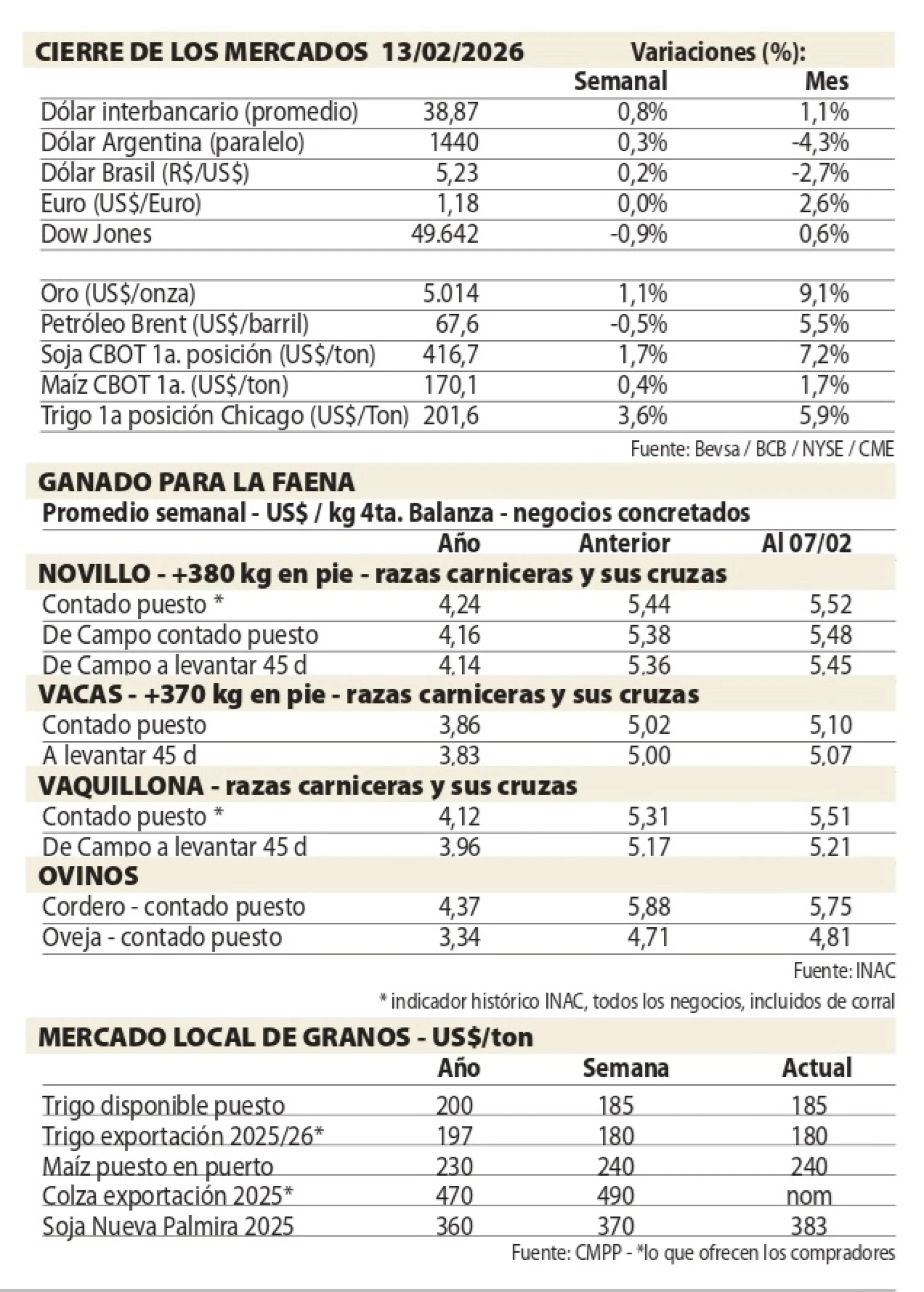 La soja subió en el mercado internacional y la tendencia se trasladó al plano local. En Chicago la posición julio (referencia para la próxima cosecha) cerró la semana en 426,4 US$/ton, una suba de 2,4%; una suba similar tuvo la primera posición. A nivel local, se están ofreciendo 383 US$/ton puesta en depósito, aunque los productores son cautos para concretar ventas. Esperan evaluar cómo quedarán los cultivos luego de estas últimas lluvias, para tener una estimación más precisa de cosecha.