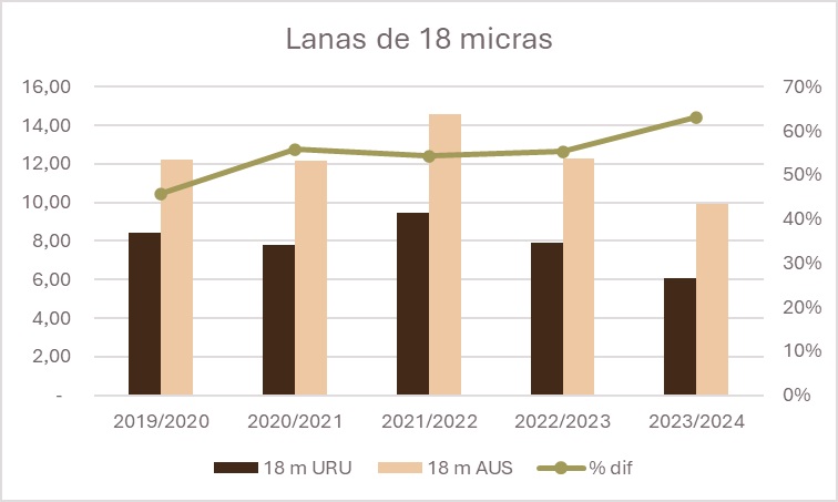 Comparando la diferencia entre el promedio para las lanas de 18 micras en Australia y su contraparte en Uruguay, en 2019/20 era del 46%. En la presente zafra, esa misma diferencia está en el 63%.