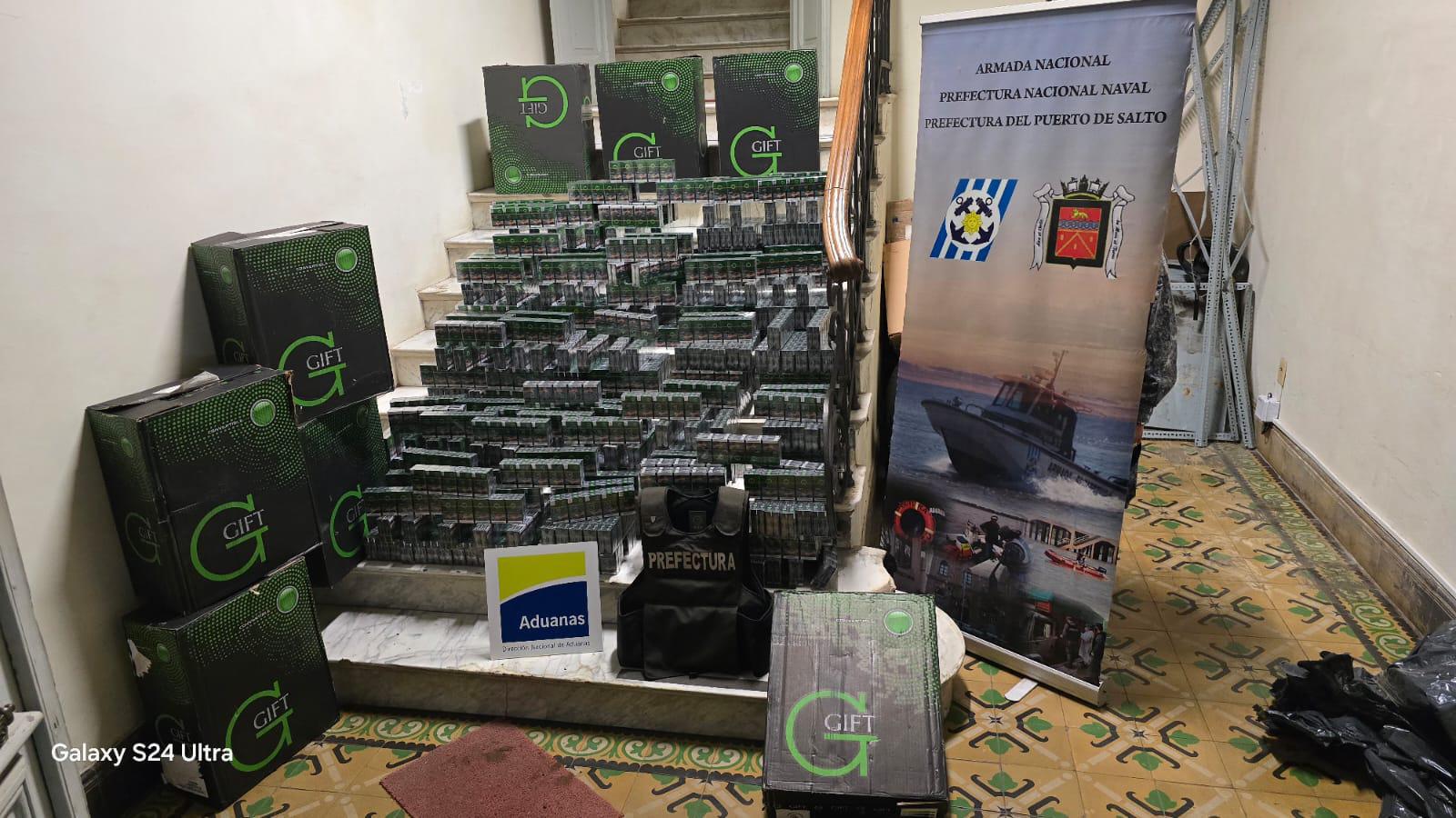 Efectivos de Prefectura que se encontraba de patrulla a bordo del móvil arn 2424 avistan una embarcación navegando hacia costas uruguayas con bultos. Al arribar al lugar, observan que dos personas se dan a la fuga en un auto marca renault, modelo 11, hacia la ciudad siendo interceptados. Uno de los hombres que se encontraba en el auto se dio a la fuga pudiendo detener al propietario del auto el N.A.C.G, de 36 años de edad, el cual transportaba 8 bultos que contenían cigarrillos. Se dio intervención a la fiscal de 3er turno Dra. Lloreley Escobar.