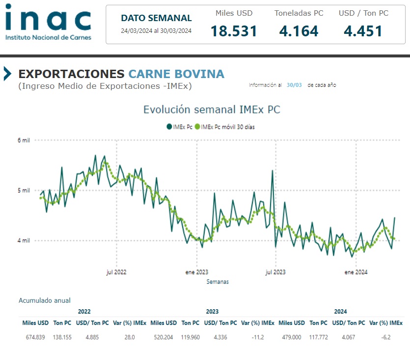 Los datos preliminares publicados este miércoles por el Instituto Nacional de Carnes (INAC) revelaron un aumento significativo en el precio de la tonelada exportada de carne vacuna en Uruguay durante el primer trimestre del año.