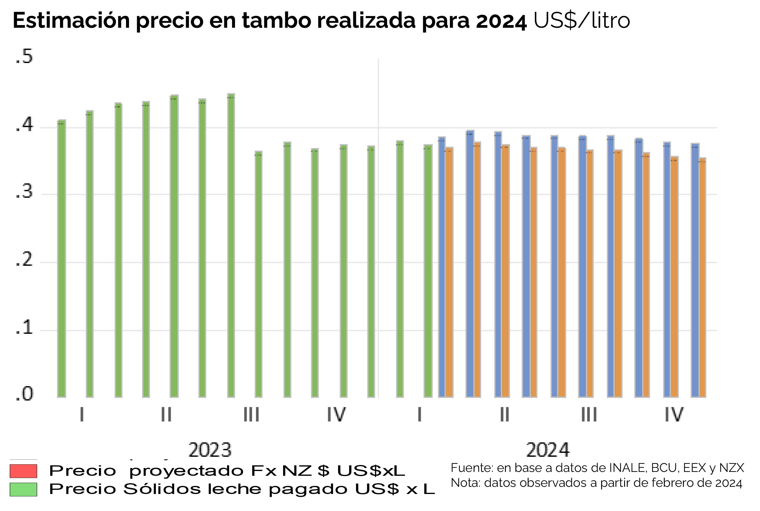 El equipo técnico de Inale ha desarrollado dos modelos para estimar el precio de la leche en tambo en 2024. El primero, basado en series de tiempo, sitúa el precio entre US$ 0,37 y US$ 0,39. Mientras tanto, el segundo modelo, fundamentado en un enfoque de simulación de probabilidades, establece un rango de US$ 0,32 a US$ 0,37.