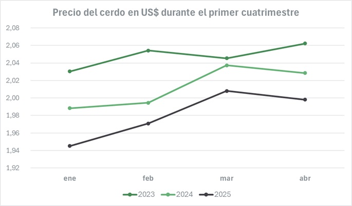 Al analizar en dólares, el resultado es inverso, en 2025 el valor promedio se ubica en US$ 1,98, posicionándose 1,5% por debajo de la referencia de 2024 y cae 3,4% frente a 2023. A pesar de este descenso, entre enero y abril de 2025, hubo una recuperación de los valores del 2,7% en dólares.