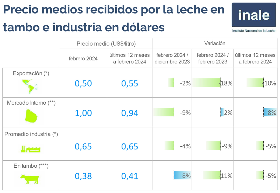 Este panorama determinó que el precio promedio recibido por la industria láctea descendiera un 9% en relación con febrero de 2023. En cuanto al precio en los tambos, este se situó en US$ 0,38 por litro, representando un descenso del 11%.