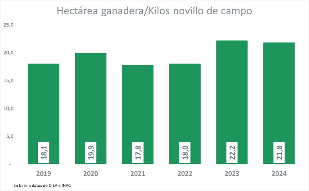 Estos contratos de arrendamiento se realizan, en varias ocasiones, en kilos de novillos en cuarta balanza. Por lo que hemos tomado como referencia el valor promedio del novillo de campo en la web del Instituto Nacional de Carnes (INAC) para cada año, donde se observa un incremento del 4,1% en el valor de la hacienda, que pasó de US$ 3,70 de promedio en 2023 a US$ 3,85 en 2024.