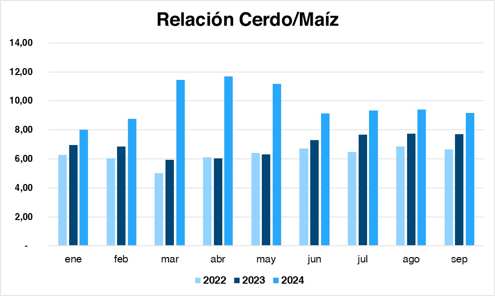 Frente a setiembre de 2023, la baja en el precio del cereal fue del 19,6%, con un valor del dólar que se valorizó un 7,1% y el valor promedio del cerdo en pesos, subió 4,77%. Delante de estos cambios, el poder de compra de maíz, por parte del productor, paso de 7,54 kilos en setiembre de 2023, a 9,18 kilos por kilo de cerdo en 2024, un aumento del 21,75%.