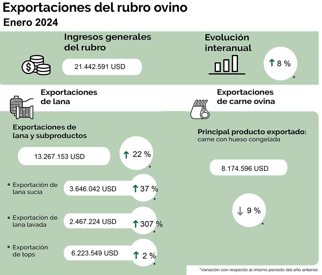 El Secretariado Uruguayo de la Lana (SUL) ha publicado el informe de exportaciones del rubro ovino correspondiente al mes de enero de 2024, revelando una marcada disparidad en el desempeño de los sectores de lana y carne.