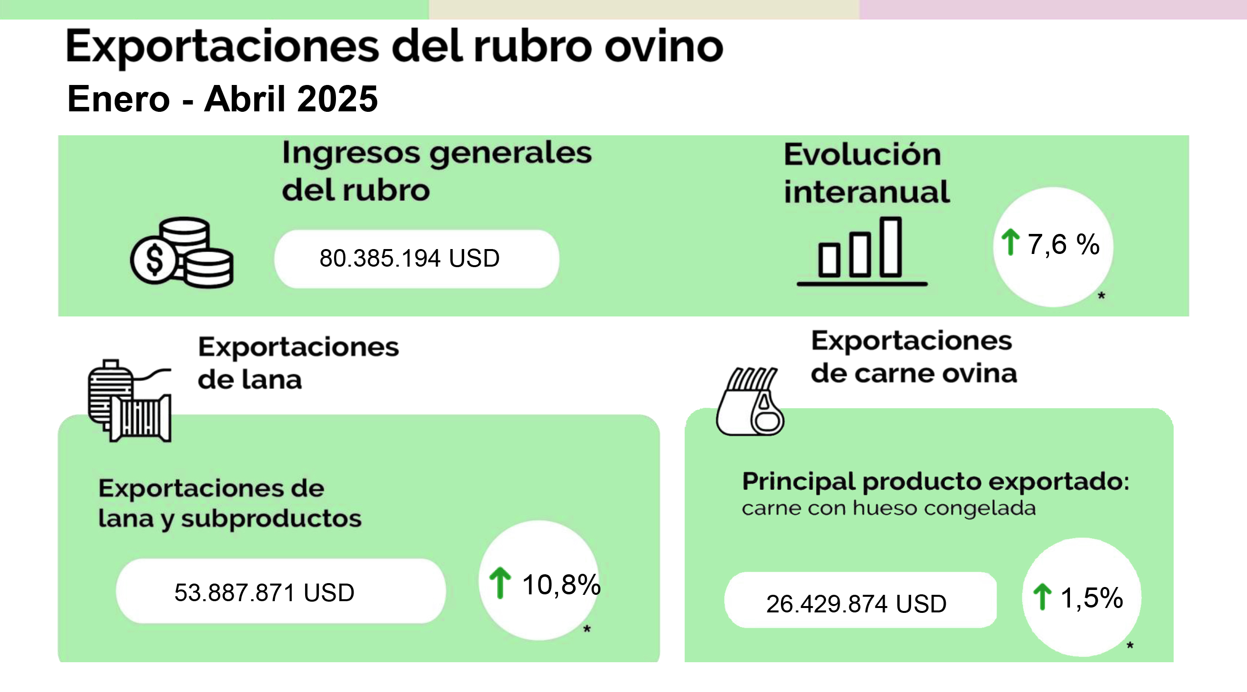 El rubro lana y productos de lana fue el principal motor del crecimiento, con exportaciones que totalizaron US$ 53.887.871 en el cuatrimestre, lo que representa un aumento del 10,8% respecto a enero-abril de 2024. Este segmento representó el 67,0% del valor total exportado del sector ovino en el período.