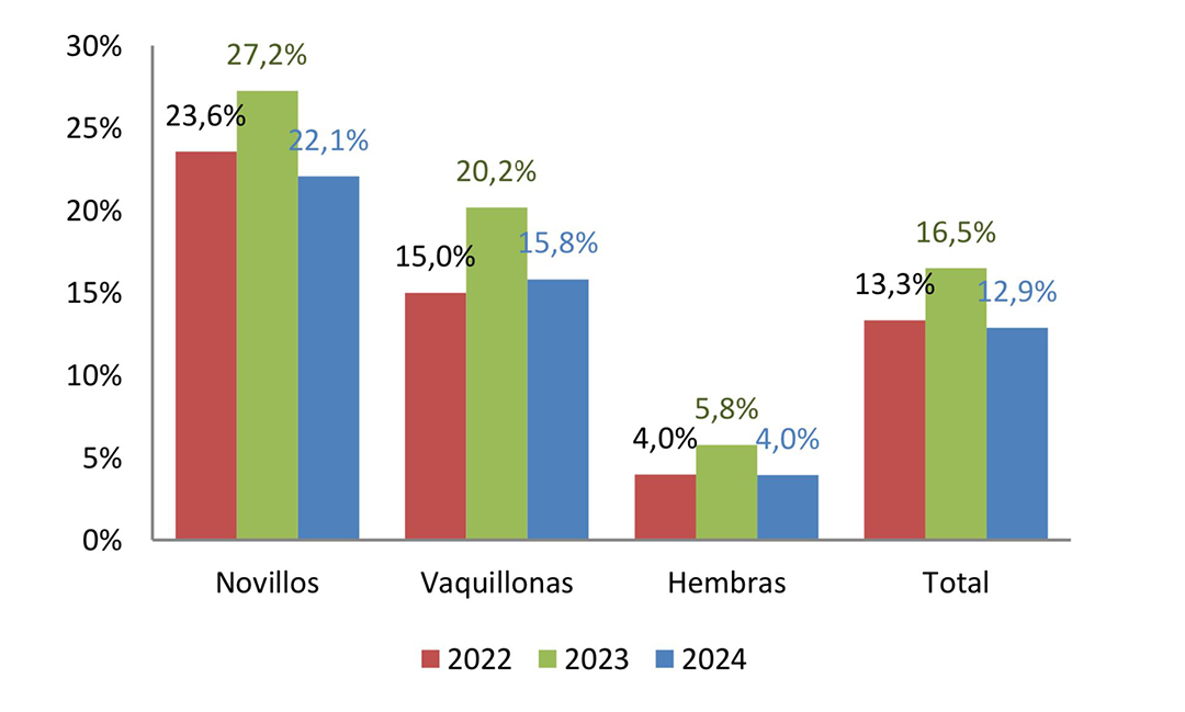 La faena vacuna creció un 7,5% en el primer semestre de 2024 (hasta el 29 de junio), con una mayor presencia tanto de vacas como de novillos, sin embargo, la faena de corral ha tenido un comportamiento bajista en igual período, situándose en un 12,9% del total a nivel nacional.