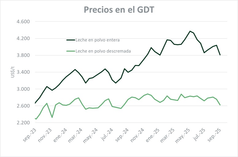 El valor promedio para la leche en polvo entera (LPE) fue de US$ 3.809 por tonelada en esta licitación y marcó una baja del 5,3% respecto a la venta anterior (-US$/ton 227). Los contratos de LPE a futuro cerraron con descensos en todas las posiciones, entre octubre y febrero de 2025. Los negocios de noviembre y diciembre, que son los de mayor volumen comercializado, se posicionaron en US$ 3.819 por tonelada y US$ 3.776, con bajas del 5,9% y 5,3% respectivamente.