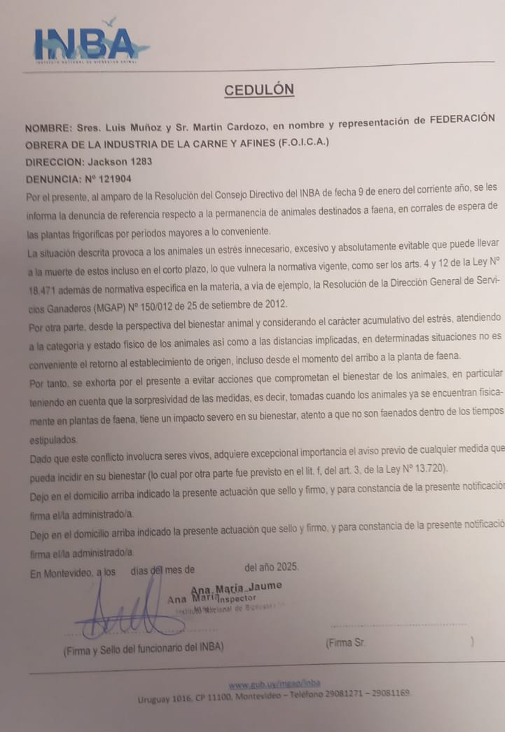 Desde el órgano que reúne a los trabajadores, se entiende que el documento del INBA, «invoca regulaciones que son para los frigoríficos» y que «los animales son de los productores y se los venden a los frigoríficos, son ellos quienes deben garantizar el bienestar animal, no nosotros», según el mensaje del gremio publicado por la Asociación de Obreros y Empleados del Frigorífico Tacuarembó (AOEFRIT).