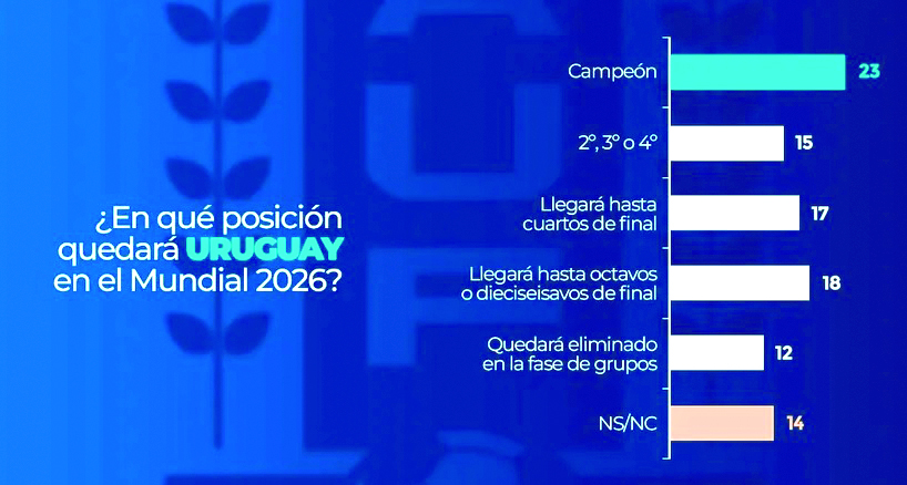 Expectativas variadas, con sesgo optimista Aunque aún faltan varios meses para el Mundial de fútbol, los uruguayos empiezan a imaginarse cómo será el desempeño celeste, luego de una Eliminatoria con momentos altos y bajos. Los datos de la encuesta de Equipos Consultores muestran que las expectativas son variadas. Hay casi uno de cada cuatro que cree que Uruguay será campeón del mundo, y casi cuatro de cada diez creen que estaremos al menos en semifinales. Pero, en sentido contrario, también hay quienes creen que quedaremos eliminados rápidamente, incluso en fase de grupos.