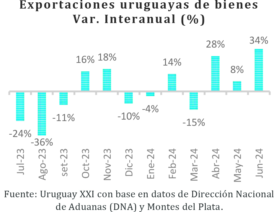 Estados Unidos fue el tercer destino con US$ 133 millones, lo que representó un aumento del 89% interanual. La carne bovina aumentó sus exportaciones considerablemente, ya que pasaron de US$ 34 millones a US$ 58 millones en junio de este año. También, al igual que para el caso brasileño, la celulosa fue un factor importante, ya que se exportaron en junio de 2024 un total de U$S 37 millones. Finalmente, las ventas de frutas cítricas se ubicaron como el tercer producto de exportación, alcanzando los U$S 13 millones, duplicando así la cifra registrada durante el pasado año.