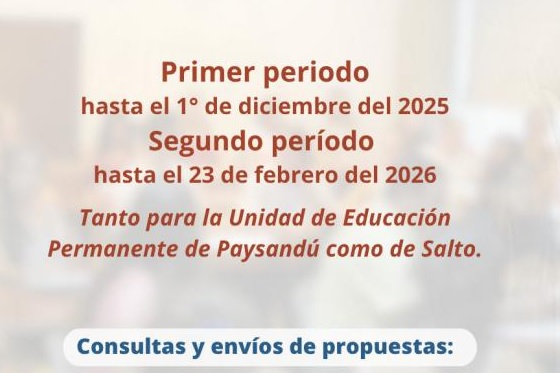 La sede Salto de la Universidad de la República, ha abierto dos plazos de convocatorias con el fin de recibir propuestas de actividades de Educación Permanente para el año 2026. La primera convocatoria cierra el próximo 1° de diciembre del presente año y la segunda convocatoria cierra el 23 de febrero del 2026. Las propuestas de cursos u otras modalidades serán para implementar en 2026 en cualquiera de las sedes del Cenur Litoral Norte: Salto, Artigas, Paysandú y Río Negro. Del mismo modo instituciones, organizaciones de la comunidad o colectivos de profesionales que deseen plantear alguna demanda puntual de capacitación a través de Educación Permanente, podrán expresarla al correo: uep@unorte.edu.uy
