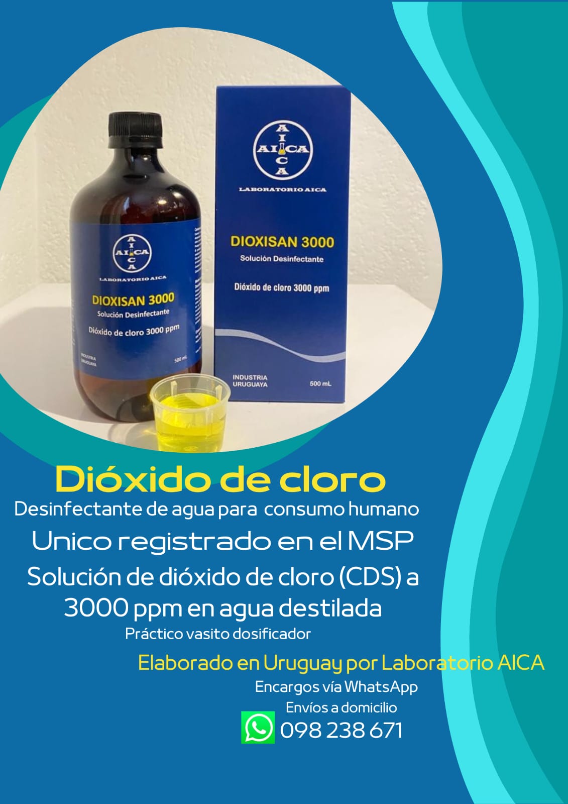 En las últimas horas comenzó a divulgarse a través de redes sociales la promoción sobre Dioxisan 3000, se trata de un producto elaborado por el laboratorio AICA en Uruguay y donde se destaca ser el único dióxido de cloro registrado en el Ministerio de Salud Pública (MSP). En la publicación se detalla además ser un “desinfectante de agua para consumo humano”, con una solución de dióxido de cloro (CDS) a 3000 ppm en agua destilada.