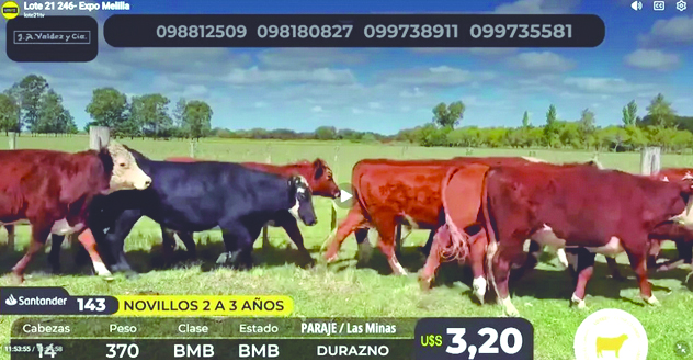 Novillos más de 3 años, máximo US$ 2,99, mínimo US$ 2,85, promedio US$ 2,90, bulto US$ 1.329,17 (5,5%).