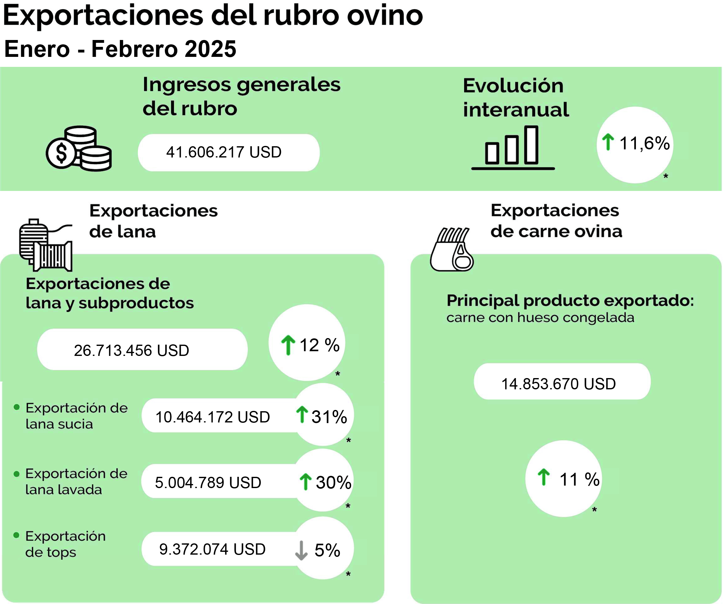 Durante los dos primeros meses del 2025, las exportaciones del rubro ovino se incrementaron un 11,6% respecto al mismo periodo del año anterior y superando los US$41 millones. Este avance, registrado en el Boletín Exportaciones del Rubro Ovino del Secretariado Uruguayo de la Lana, se ha materializado en el marco de una estrategia que combina diversificación y calidad, consolidando la posición del país en el mercado internacional a través de la exportación de lana y sus subproductos, que representan el 64,2% del total exportado.