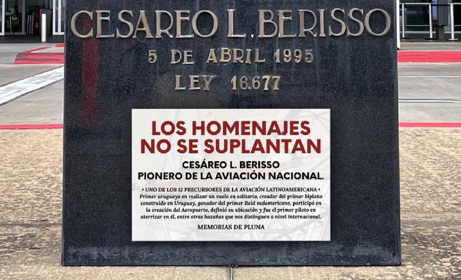 El senador por el Partido Colorado Germán Coutinho presentó un proyecto de ley para que el Aeropuerto Internacional de Carrasco lleve el nombre del expresidente Jorge Batlle. Actualmente, la terminal aérea lleva el nombre de General Cesáreo L. Berisso, en referencia a uno de los pioneros de la aviación uruguaya, quien realizó el primer vuelo en solitario en territorio nacional. Tras conocerse esta iniciativa, el colectivo Memorias de Pluna, dedicado a recordar a la desaparecida aerolínea de bandera, inició en sus redes sociales una acción en rechazo. «Los homenajes no se suplantan», afirman en una imagen publicada en Facebook, donde se ve al monolito en homenaje a Berisso intervenido por un cartel digital.