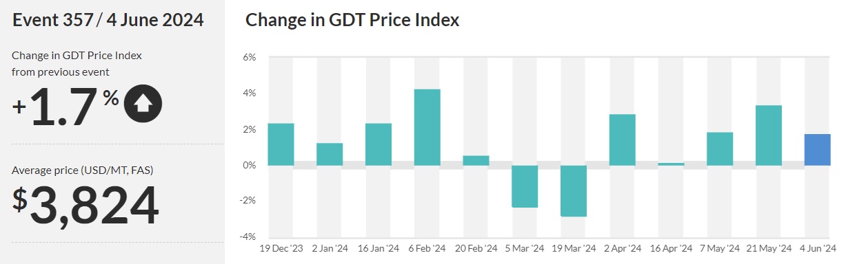 La licitación 357 de la plataforma electrónica Global Dairy Trade (GDT), dio inicio al mes de junio, este martes 4 de junio, y mantuvo la tendencia alcista de las ventas previas, tanto en las ventas tradicionales como en las licitaciones Pulse para ambas leches en polvo. El promedio registrado en el día de ayer fue el segundo mayor precio en lo que va del año, en tanto que para la leche en polvo entera se registró el valor más alto en 2024.